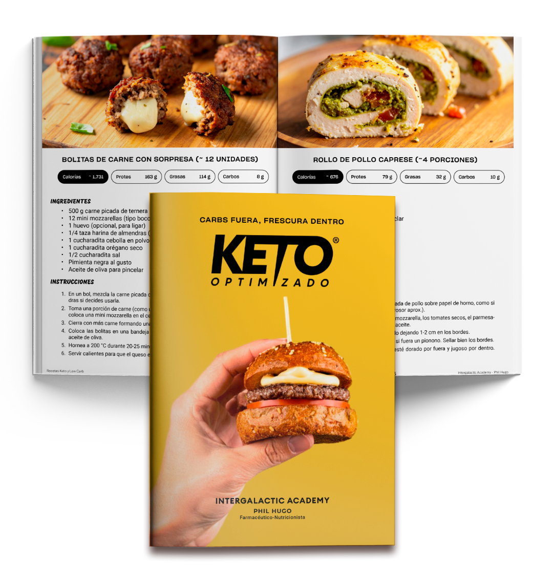 El programa Keto Optimizado es un paquete de recursos audiovisuales. Al adquirirlo, obtendrás acceso a nuestra academia, donde encontrarás videos explicativos detallados para cada sección del programa. Incluye guías descargables en formato PDF, que comprenden dos Guías de Nutrición con 5 protocolos nutricionales, secciones teóricas y planes con platos y recetas. También dispondrás de una guía de entrenamiento que incluye teoría y tres rutinas diferentes, cada una con explicaciones detalladas y progresiones. Además, tendrás acceso exclusivo a nuestra comunidad privada de Telegram, donde podrás interactuar conmigo, mi equipo y muchos más intergalácticos, desde principiantes, avanzados hasta profesionales de la salud, todos ellos integrando Keto Optimizado en su vida cotidiana. Finalmente, dispondrás de 4 Bonus descargables en PDF con contenido adicional de cocina.